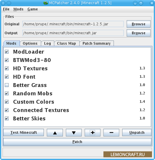 MCPatcher HD это патчер для игры minecraft, то есть автоматически заменяет стандартные классы на модифицированные. Программа добавит поддержку шрифта и текстур высокого разрешения, а так же добавит новые визуальные эффекты. MCPatcher HD может конвертировать старые текстур паки в ресурс паки. Если вы планируете в будущем устанавливать моды, то перед тем как пропатчить установите Forge/Modloder/Liteloader. Если этого не сделать, то игры будет вылетать. Если у вас сборка с модами, то перед всеми изменениями рекомендуем вам сделать резервную копию файлов.